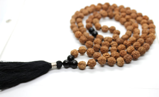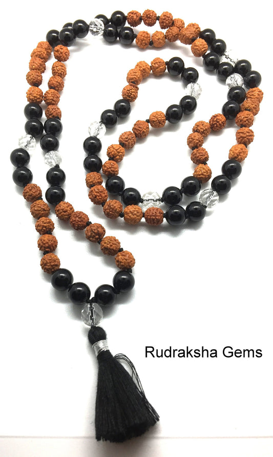 108 Rudraksha Mala Beaded Necklace, Mala Bead Necklace +Crystal Black Onyx Gemstones, Tibetan Buddhist Prayer Beads, Healing Meditation Yoga