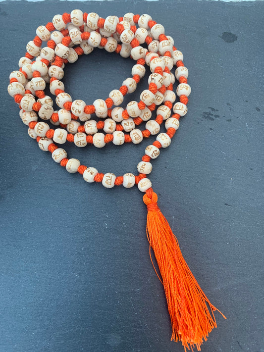 108 Tulsi Holy Basil Hand Knotted Mala engraved Hare Rama Hare Krishna beads Necklace , Yoga Meditation, Prayer Beads mala rosary Om prayer